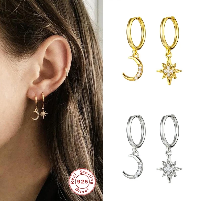 Name: Ayudante de plata 925 Luna estrellas pendientes de luna creciente minimalista apilable Huggies pendientes Starburst pendientes para las mujeres